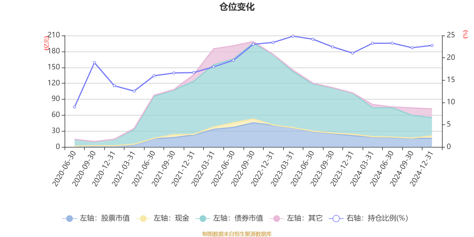 据定期报告数据统计,近三年平均股票仓位为22.34%,同类平均为18.78%。2023年一季度末基金达到24.86%的最高仓位,2020年上半年末最低,为8.99%。
