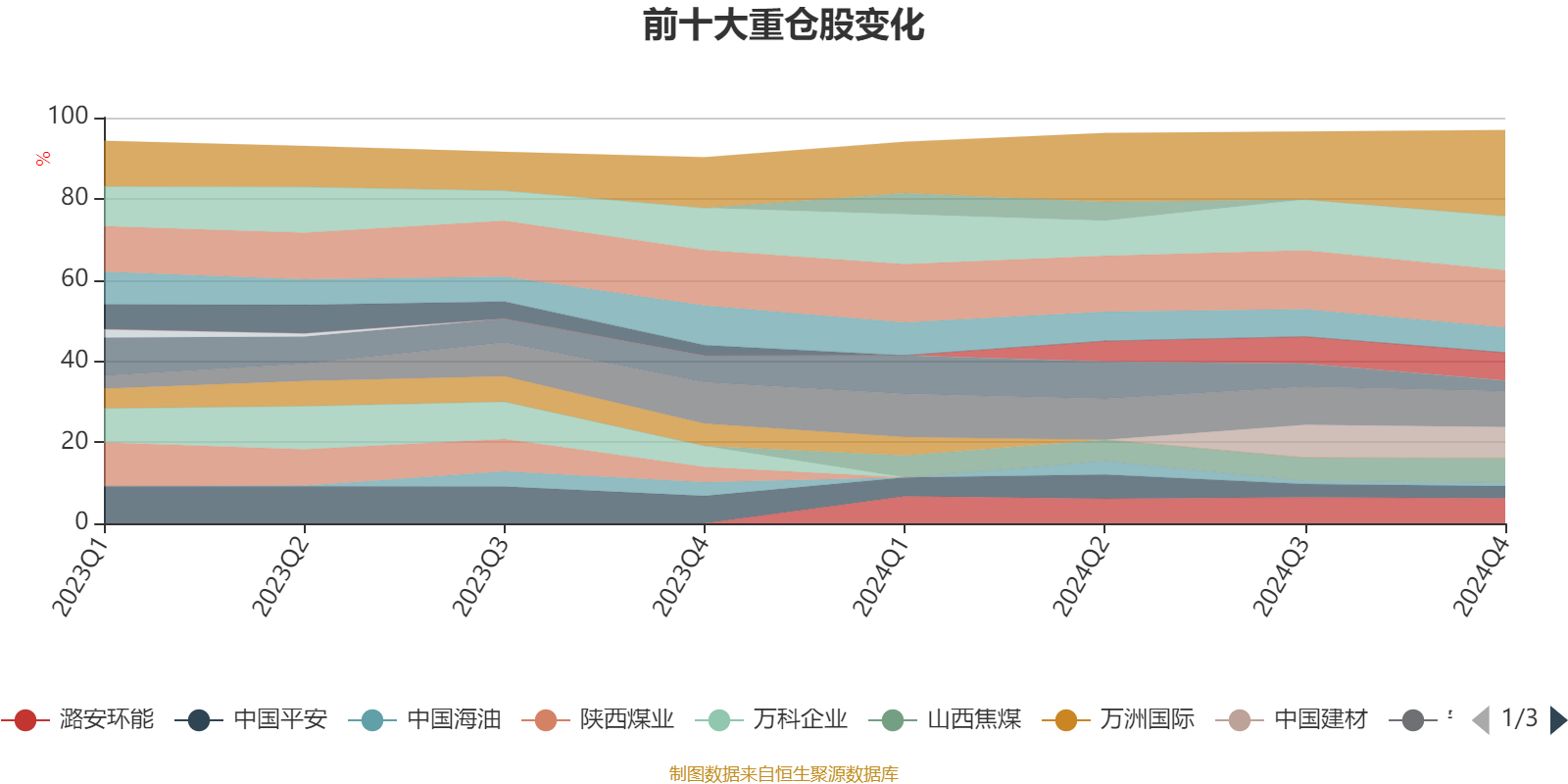 该基金持股集中度较高,且持股标的较为稳定,近2年前十大重仓股集中度长期超过60%。截至2024年四季度末,基金十大重仓股分别是中国海外发展、中国海洋石油、宁波银行、中国建材、兖煤澳大利亚、美的集团、潞安环能、山西焦煤、中国平安、海螺水泥、中国海油。